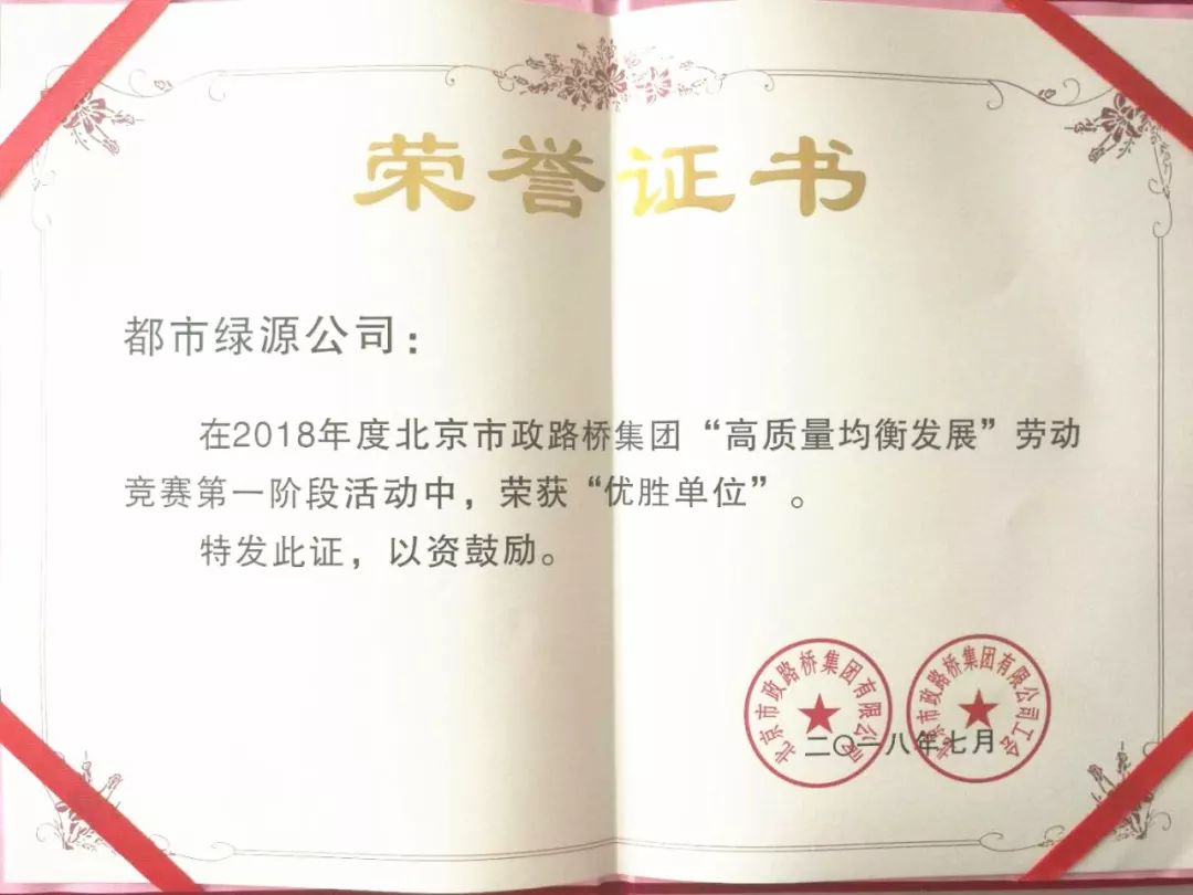 在北京市政路桥集团2018年度上半年劳动竞赛中荣获“优胜单位” 北京市市政基础设施结构长城杯工程金质奖证书