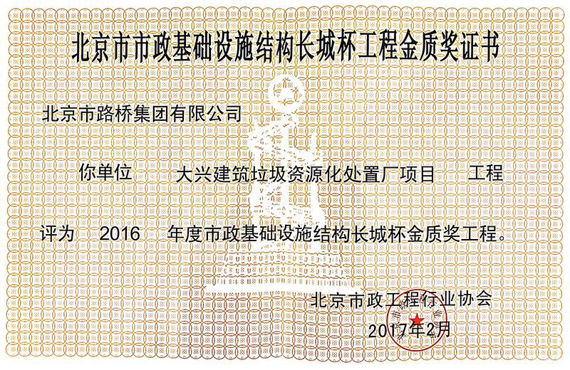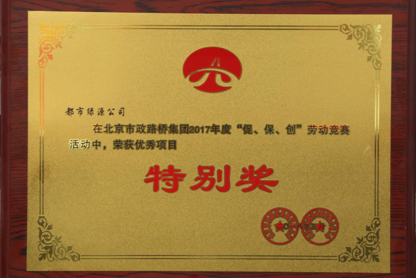 荣获2017年度北京市政路桥集团“三好项目” 在北京市政路桥集团2017年度“促、保、创”劳动竞赛中荣获“特别奖”